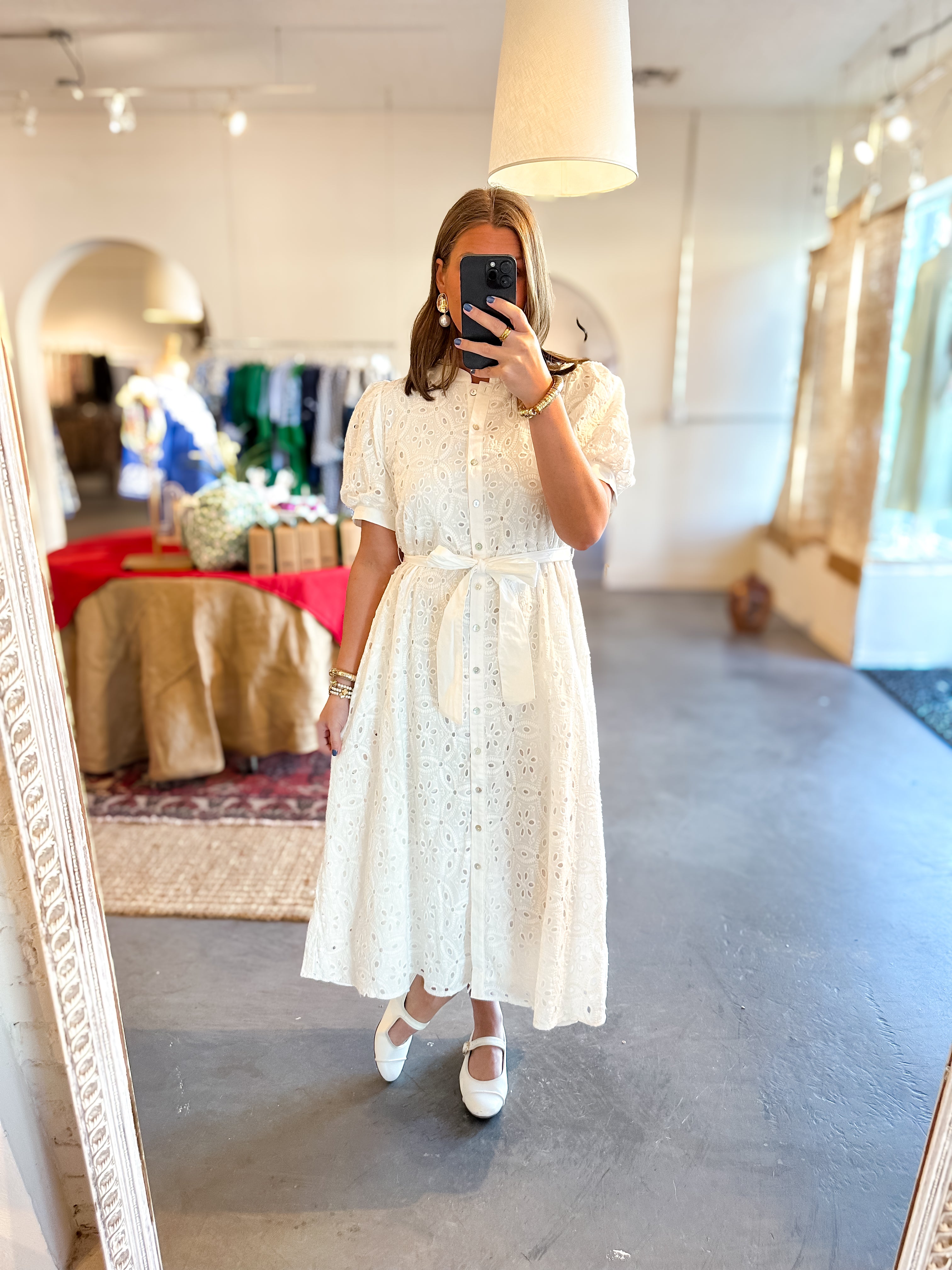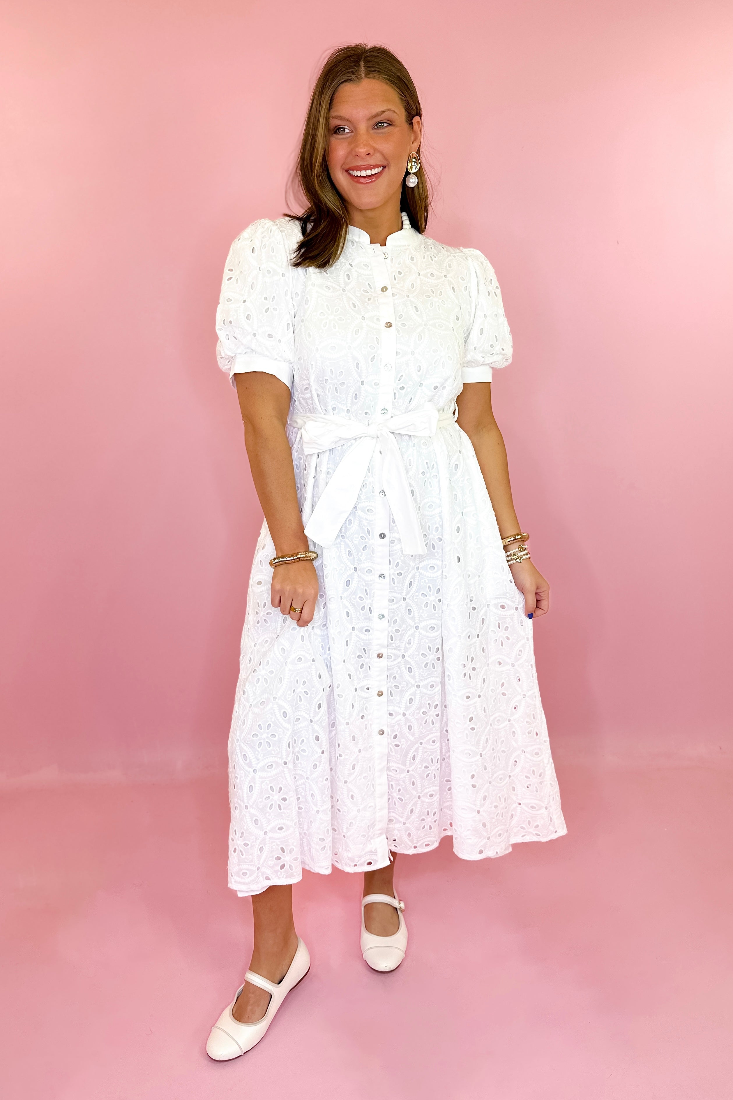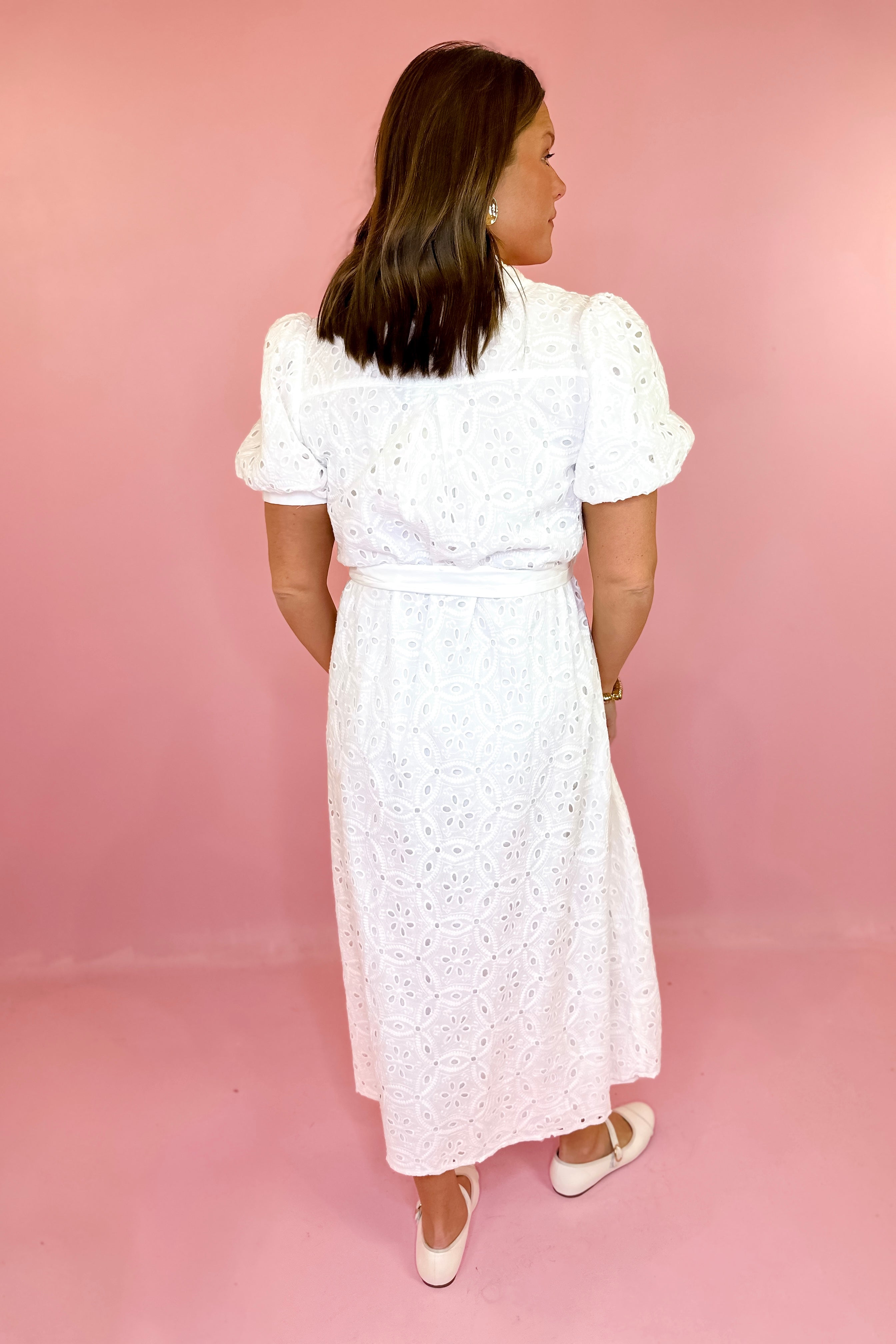 - Solid white eyelet midi dress