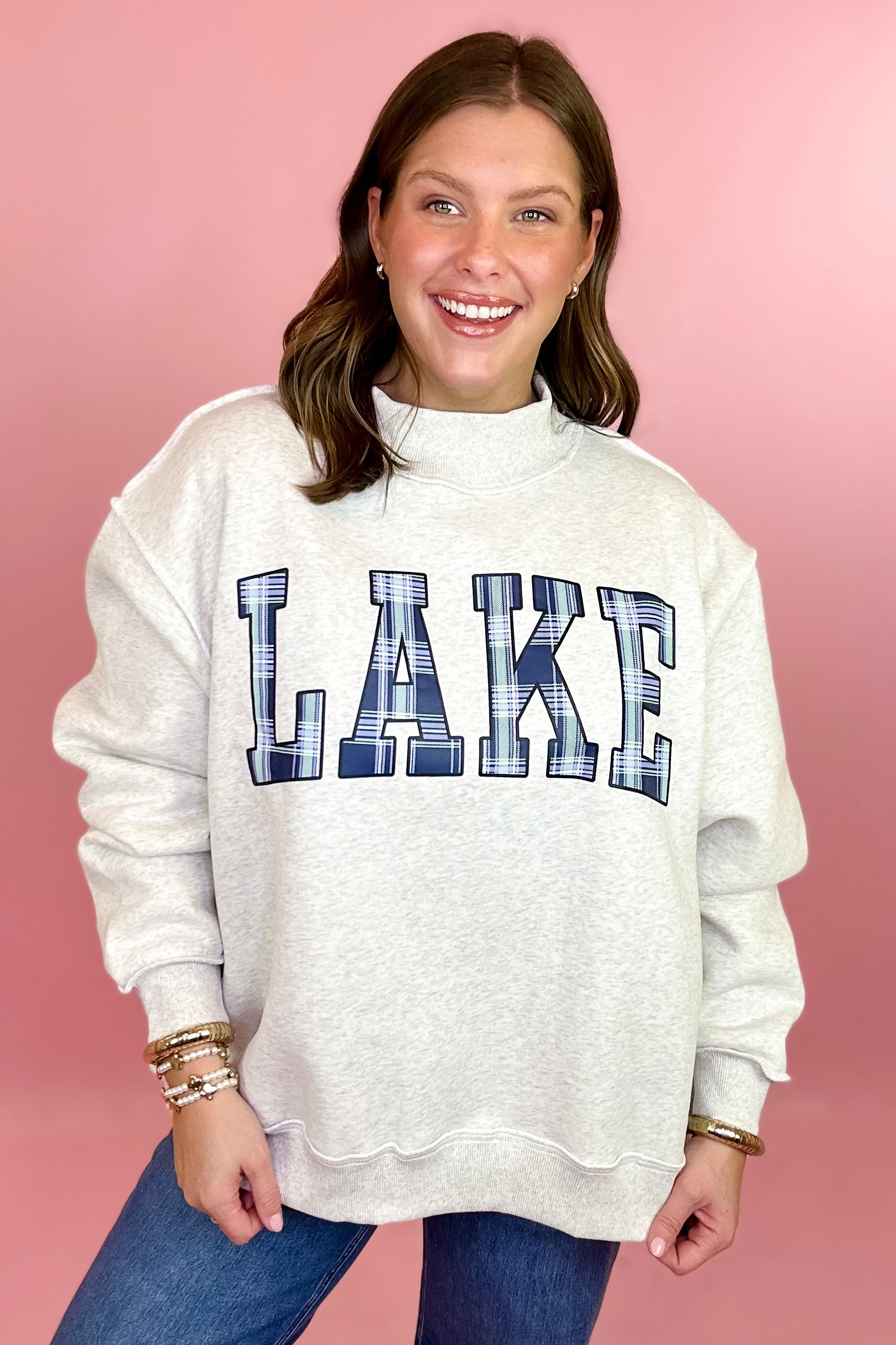 - Ash grey with LAKE on one side & MOUNTAINS written in navy plaid across the chest