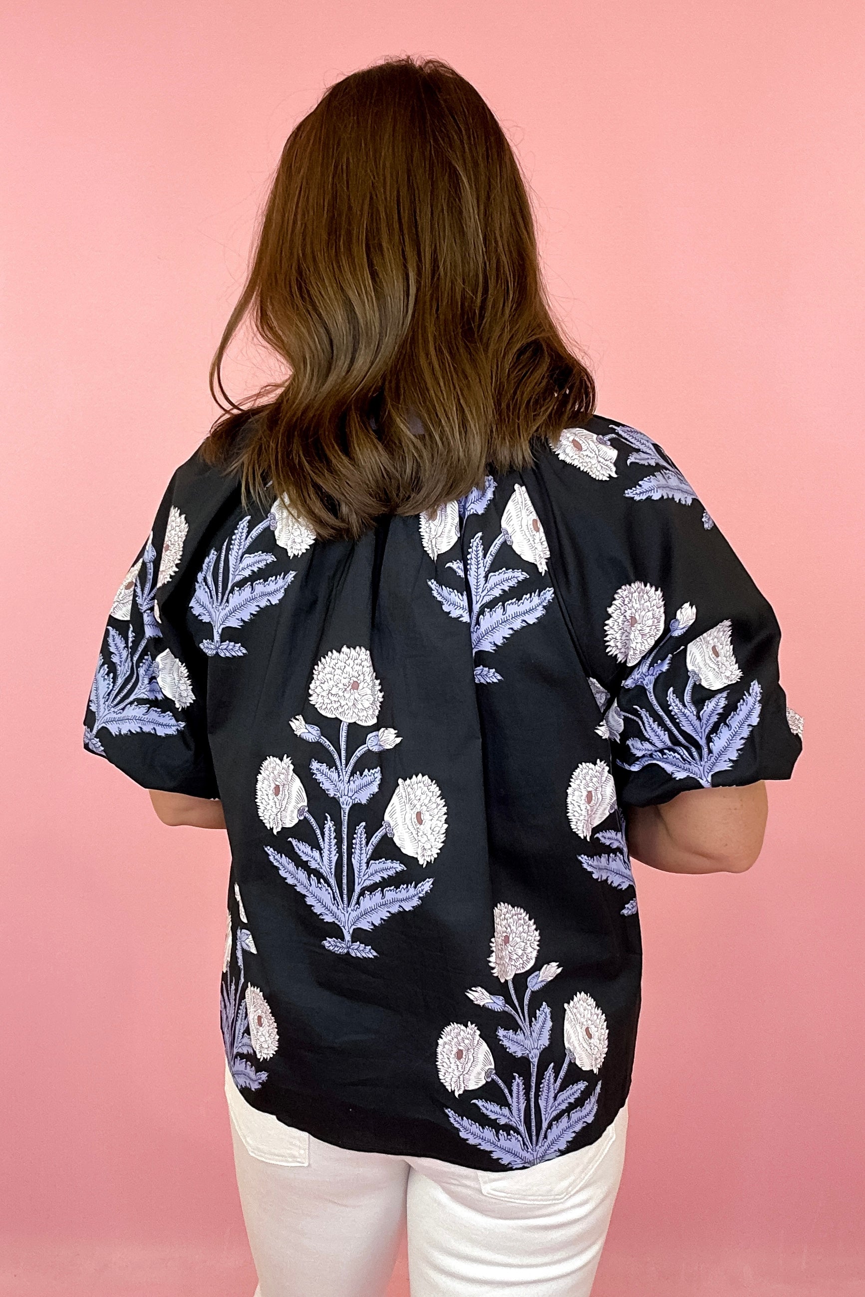 • Black top with blue and white stem floral print all over
