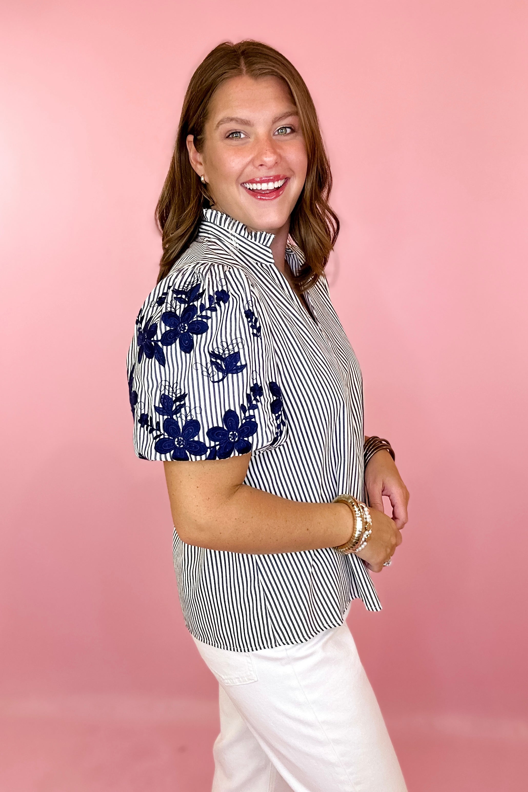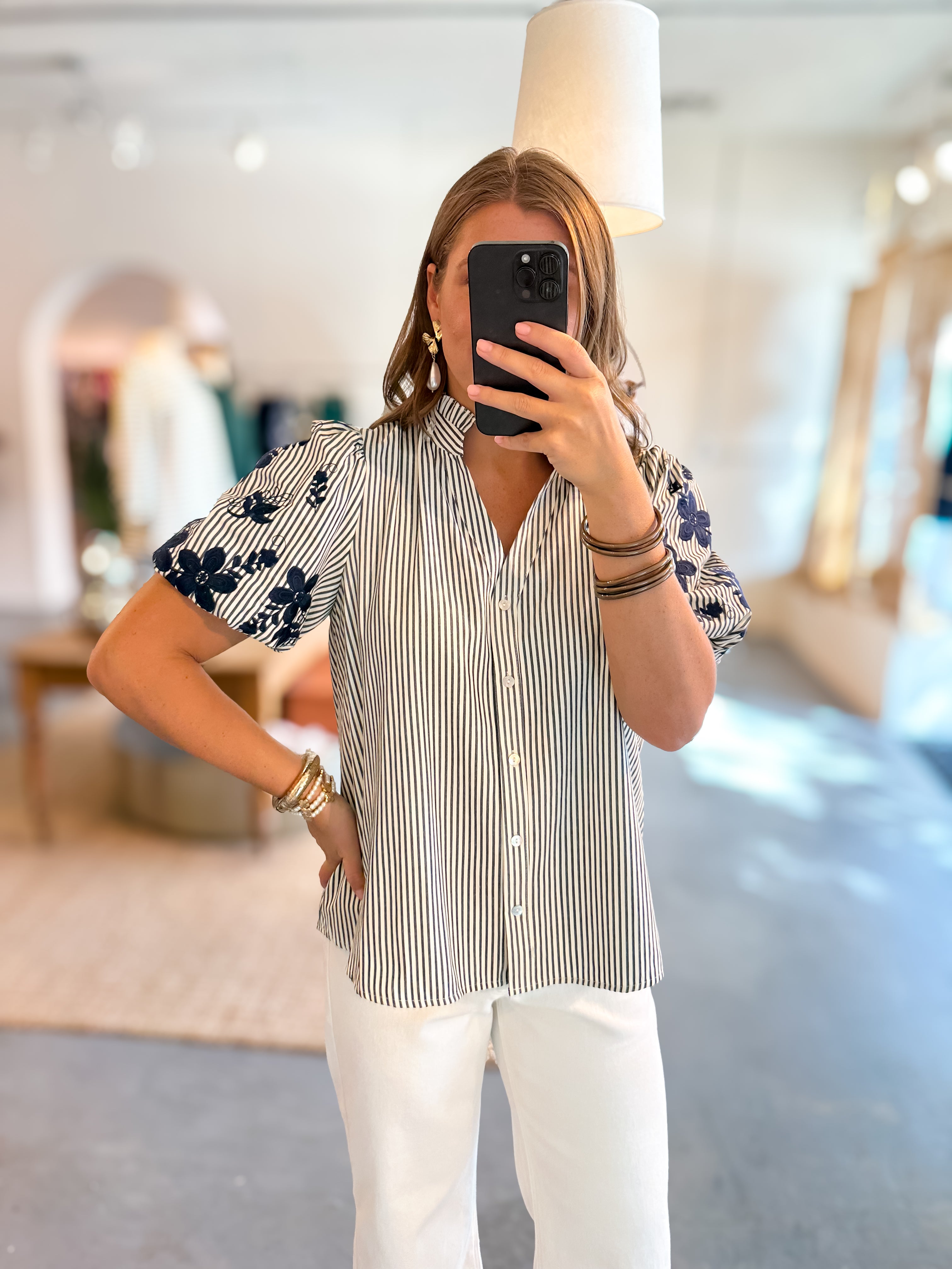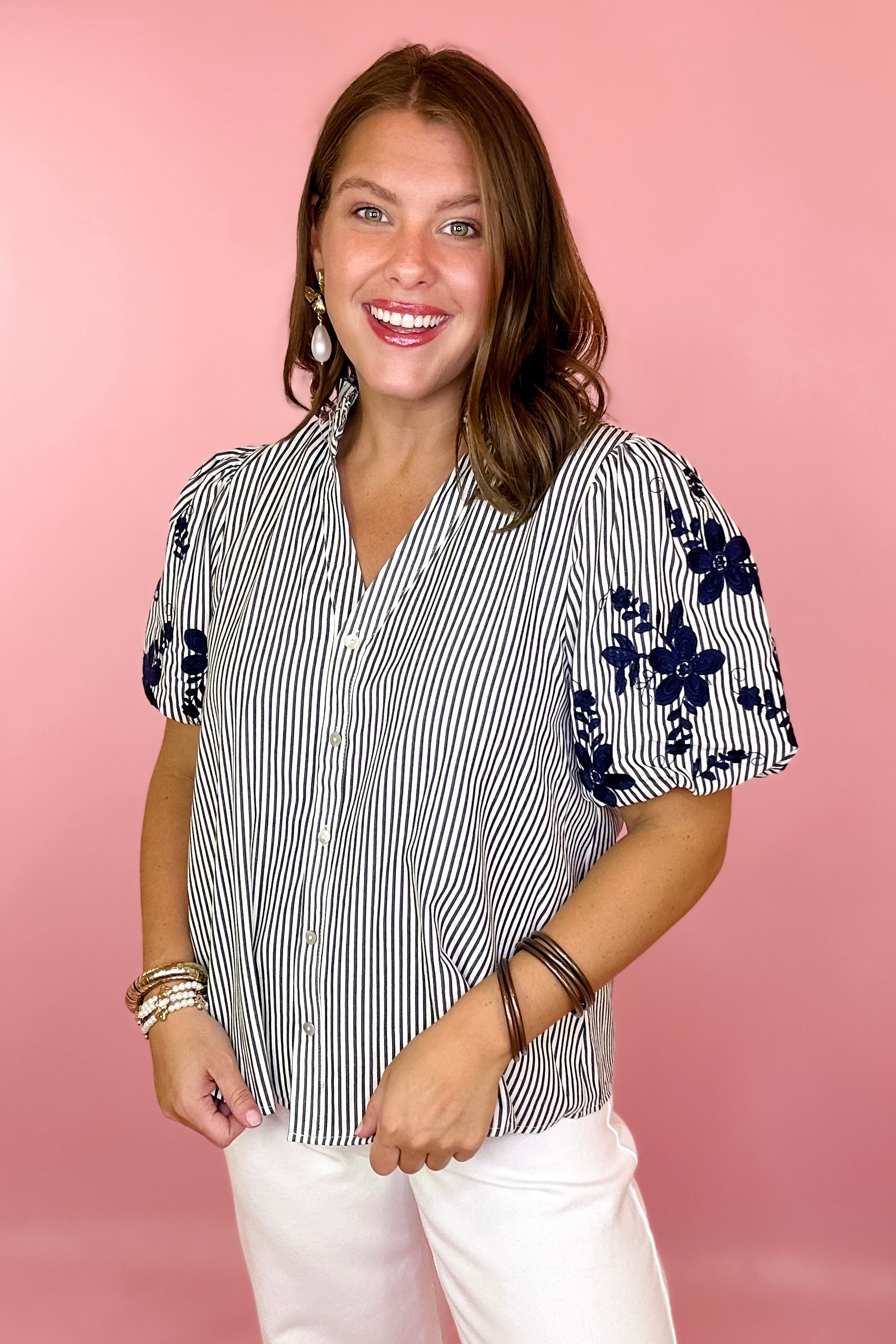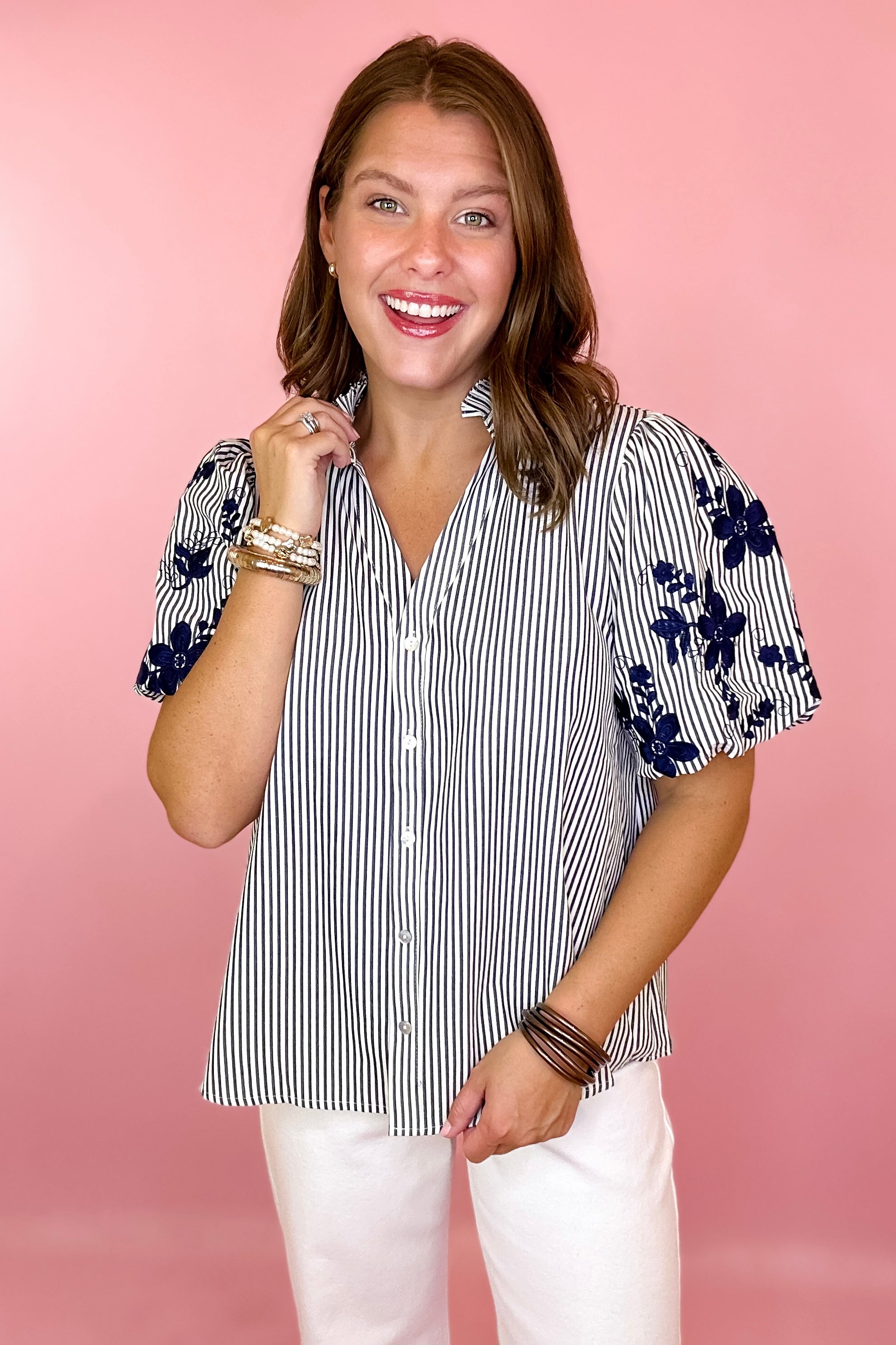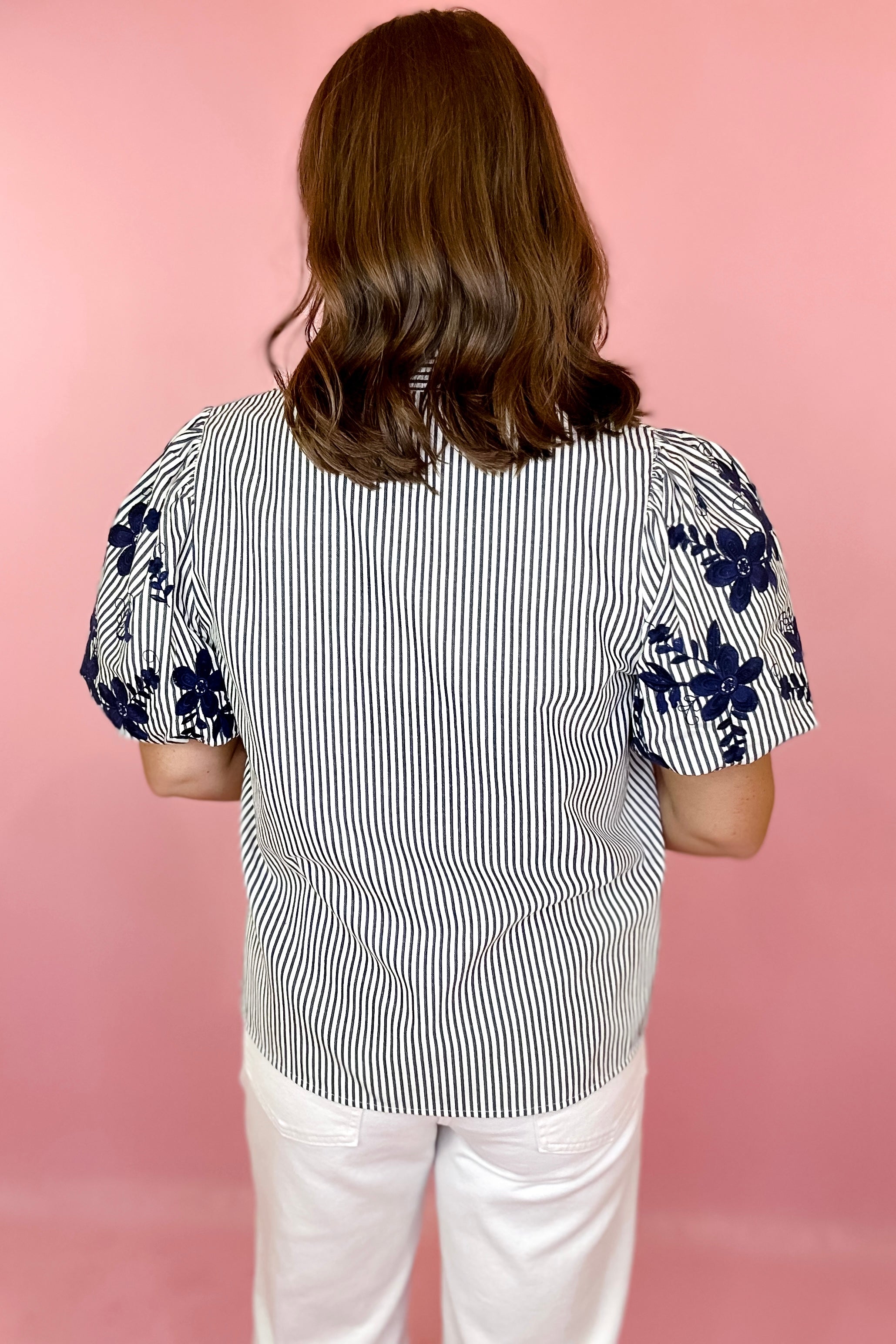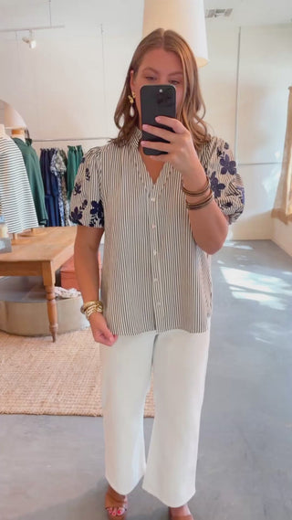 Make It Count Embroidered Stripe Button Down Top - Navy