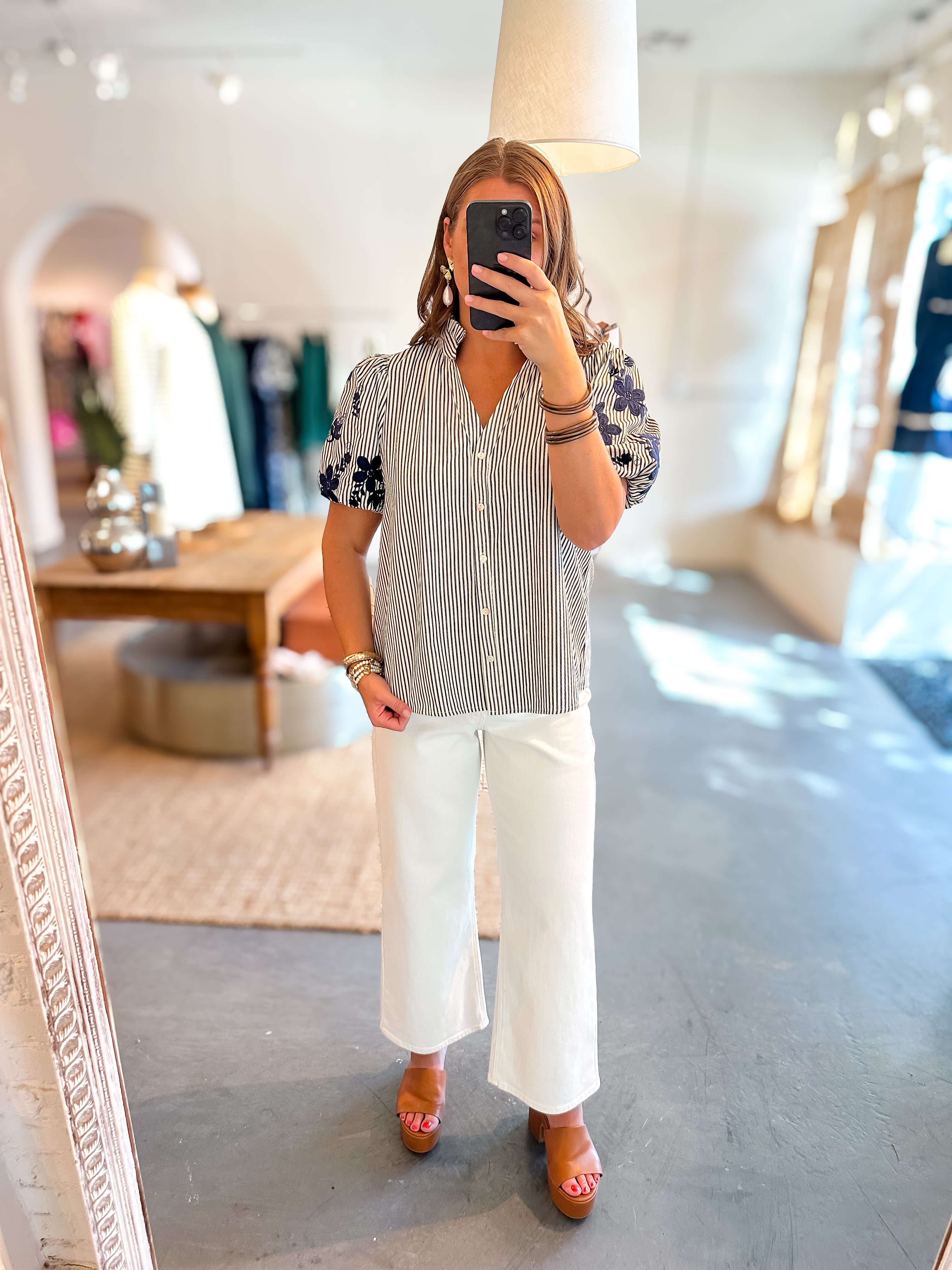 - Navy and white vertical stripe top