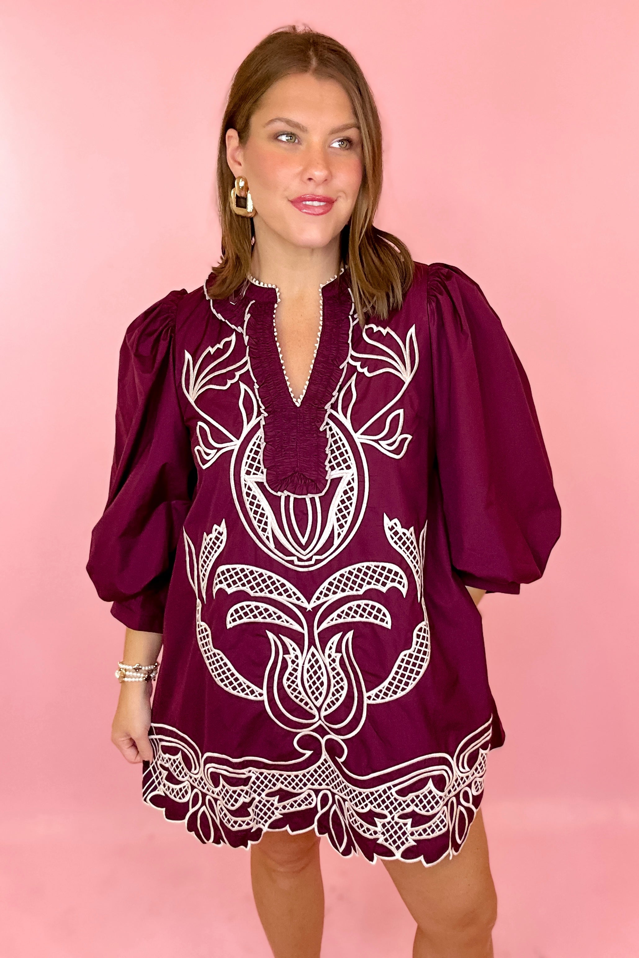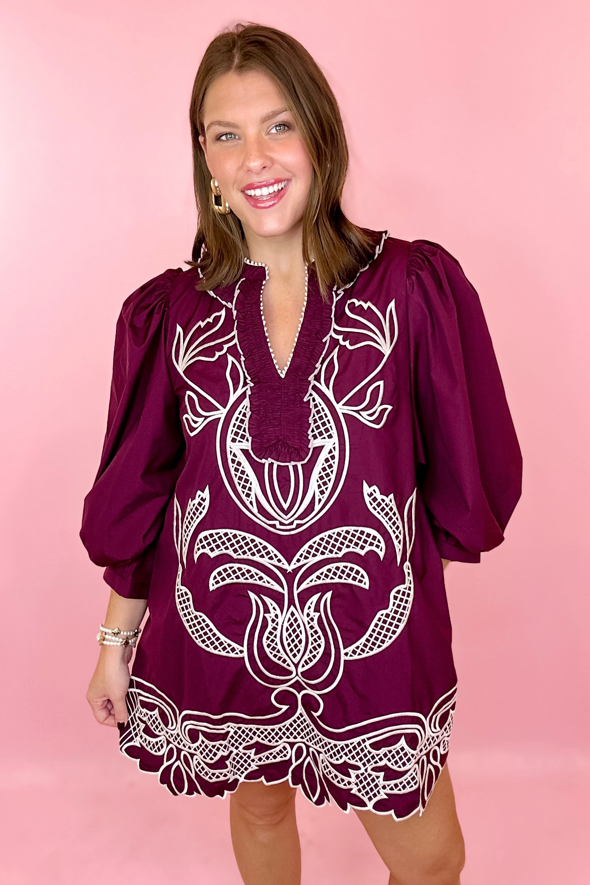 Nothing To It Embroidered Mini Dress - Merlot