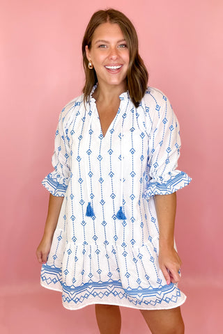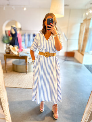 Adrienne: Audrey Ruffle Collar Midi Dress - Navy Stripe