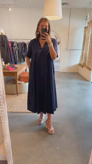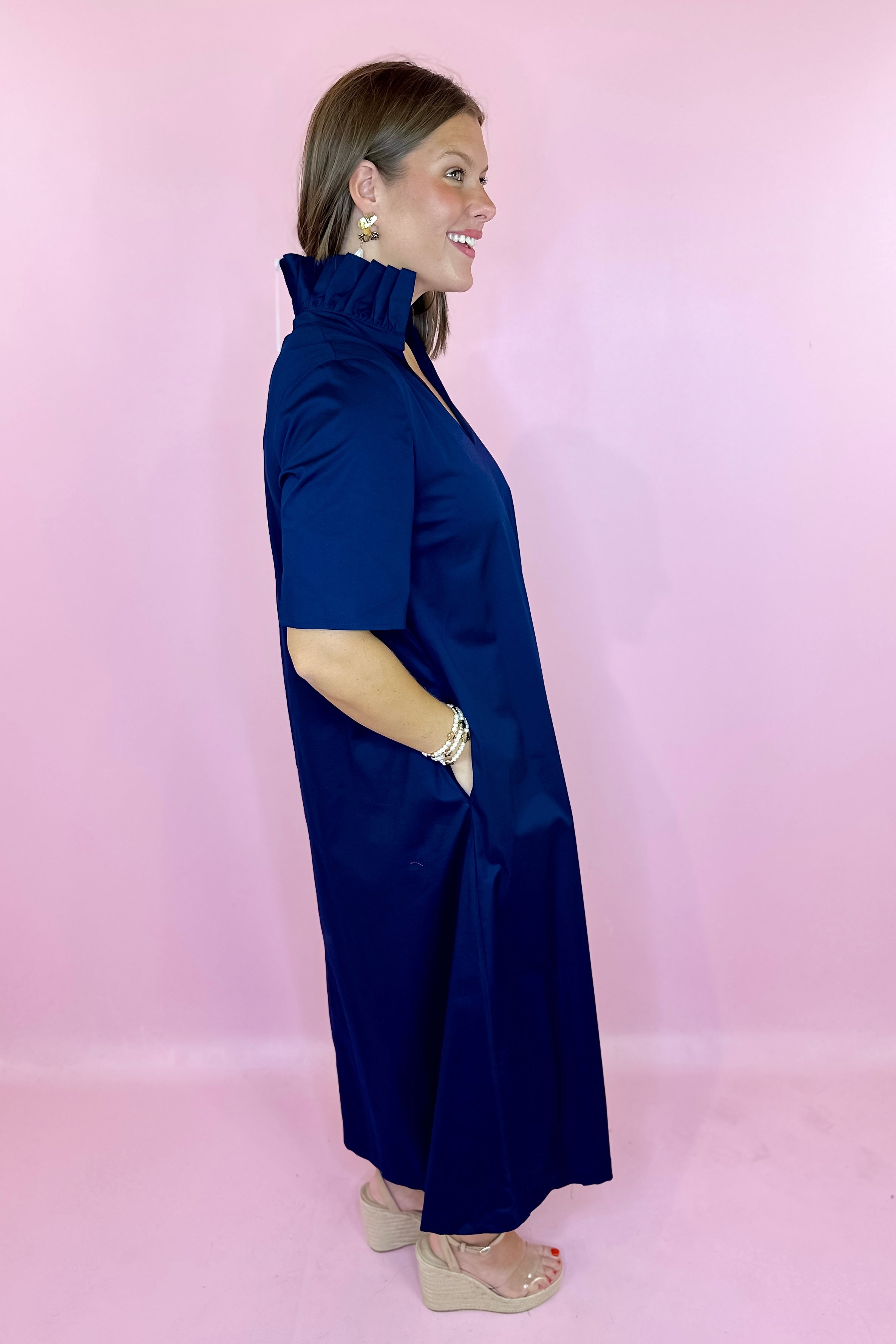 Adrienne: Audrey Ruffle Collar Midi Dress - Navy