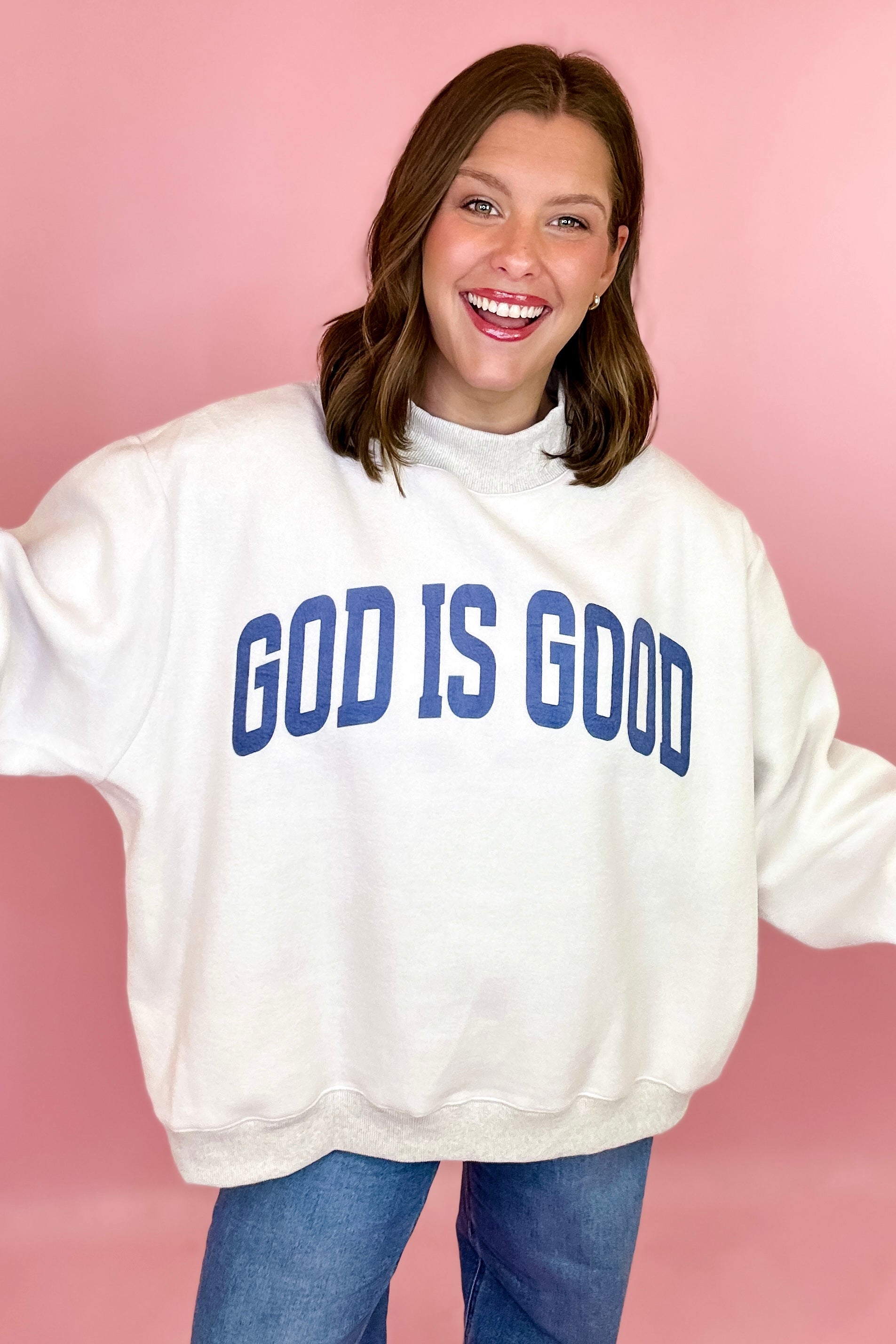 • Cream on the other side with GOD IS GOOD written in navy across the chest