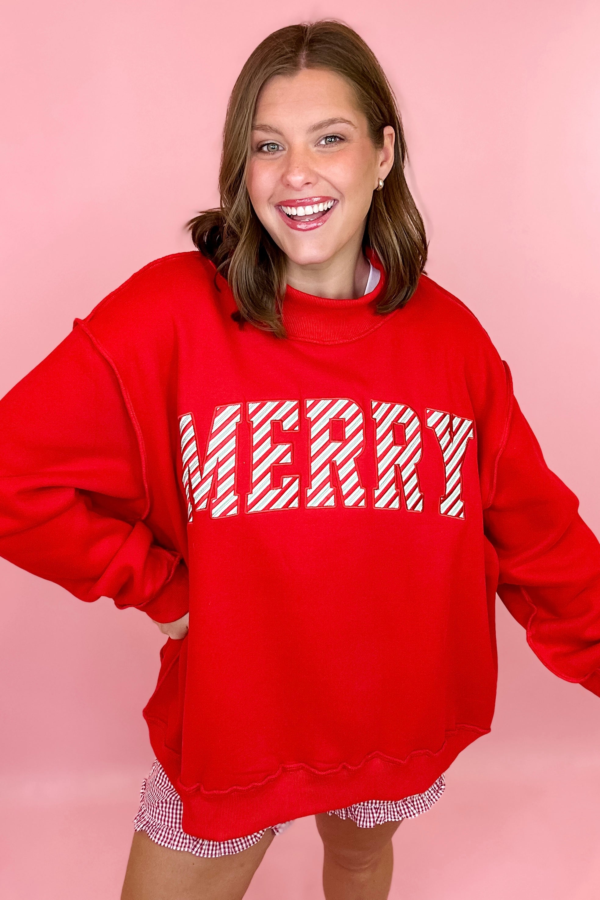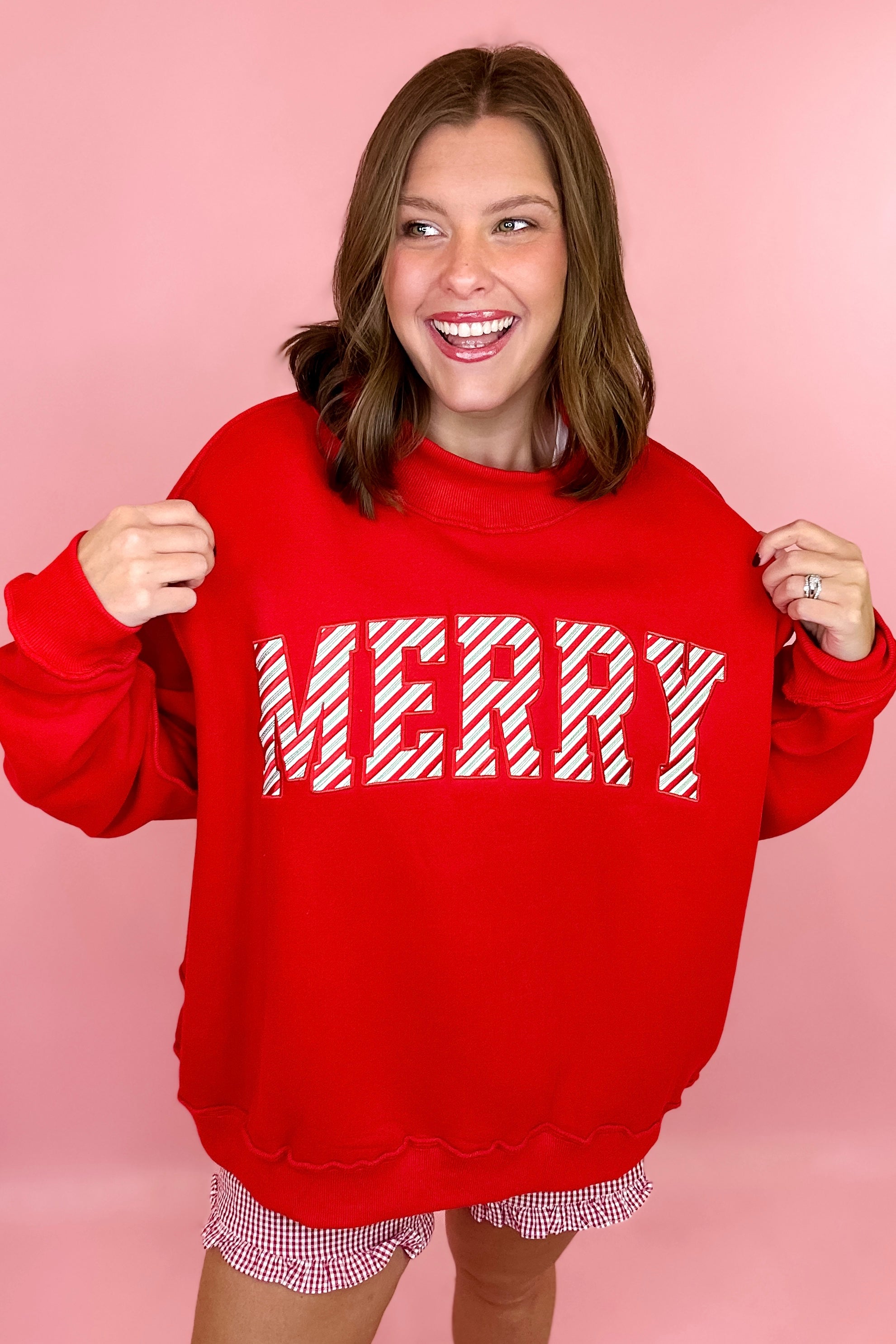 - Red with MERRY embroidered across the chest in holiday stripes