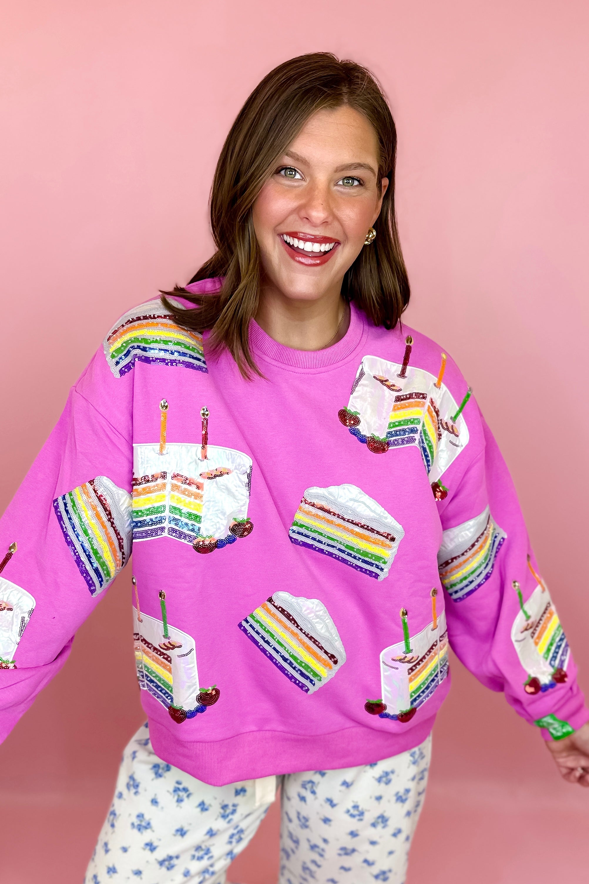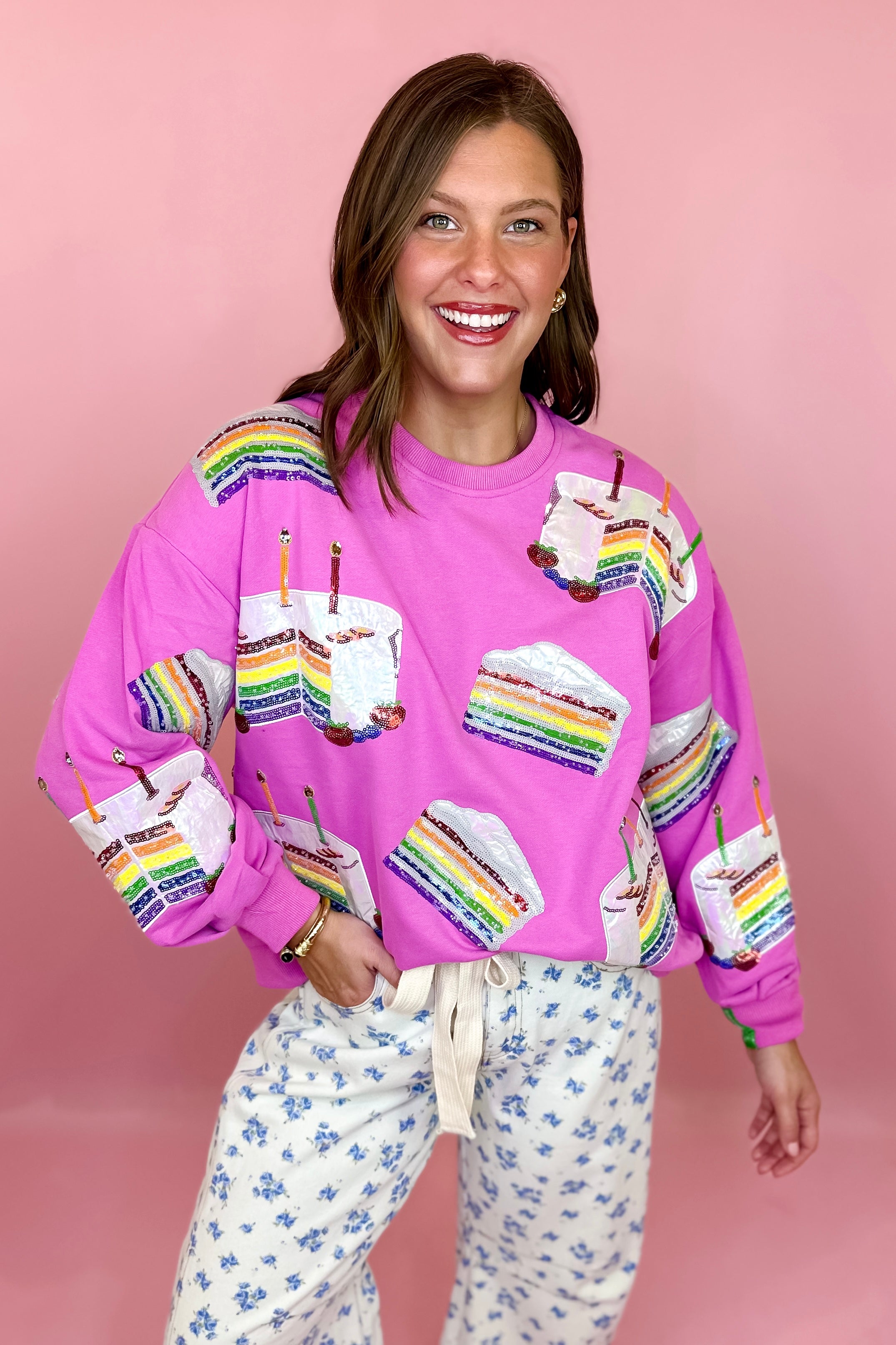 Model Stats: Izzy is 5'8", typically wears a size 10/12 in bottoms and a 38D bust. She is wearing a medium in the sweatshirt.