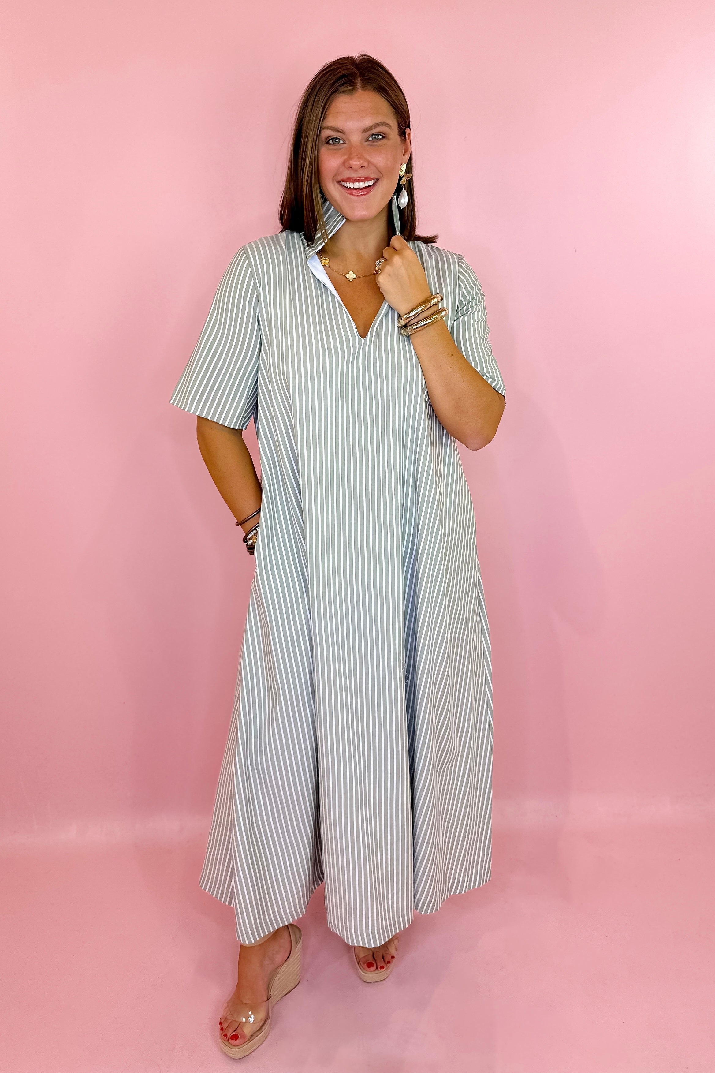 Adrienne: Audrey Ruffle Collar Midi Dress - Olive Stripe
