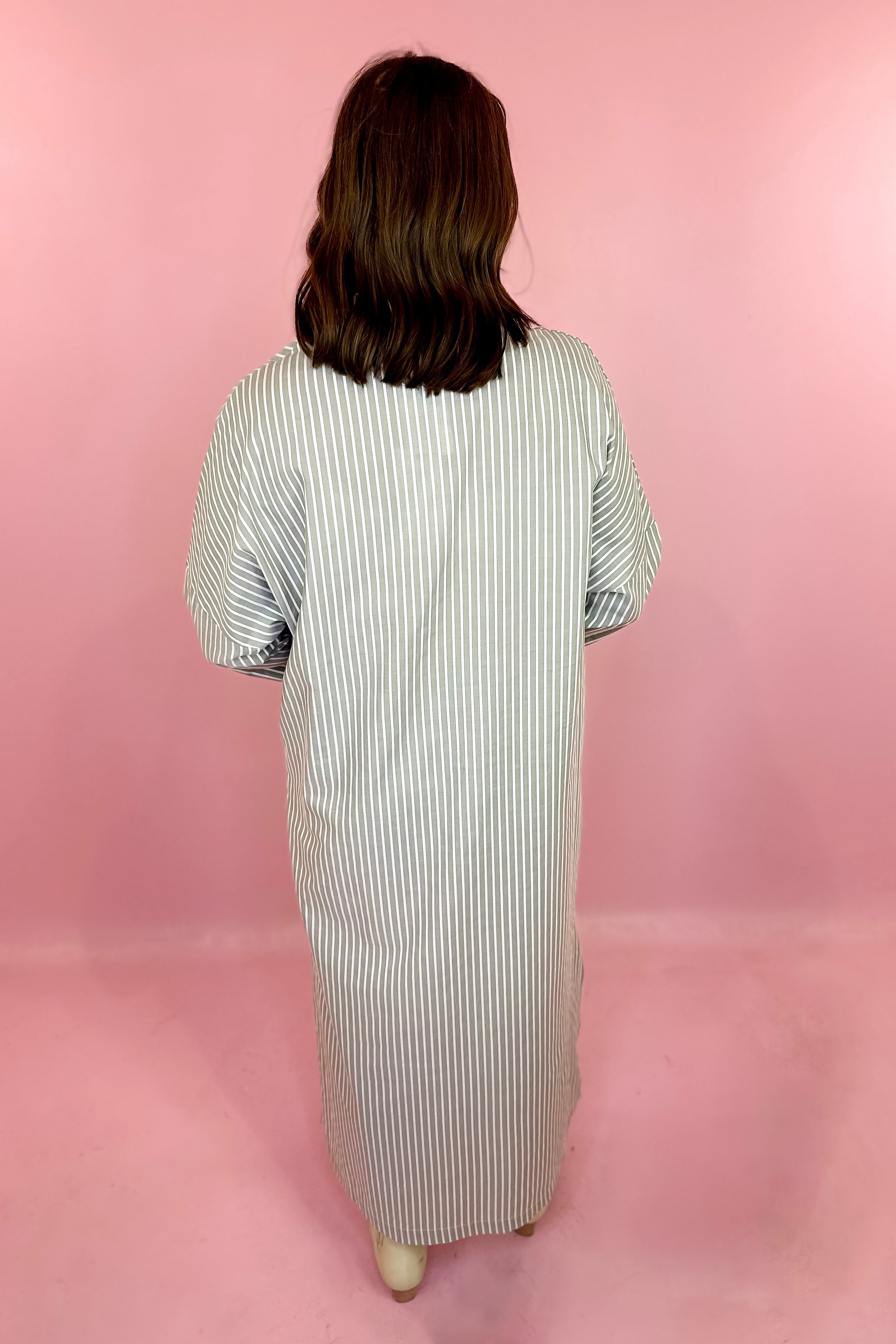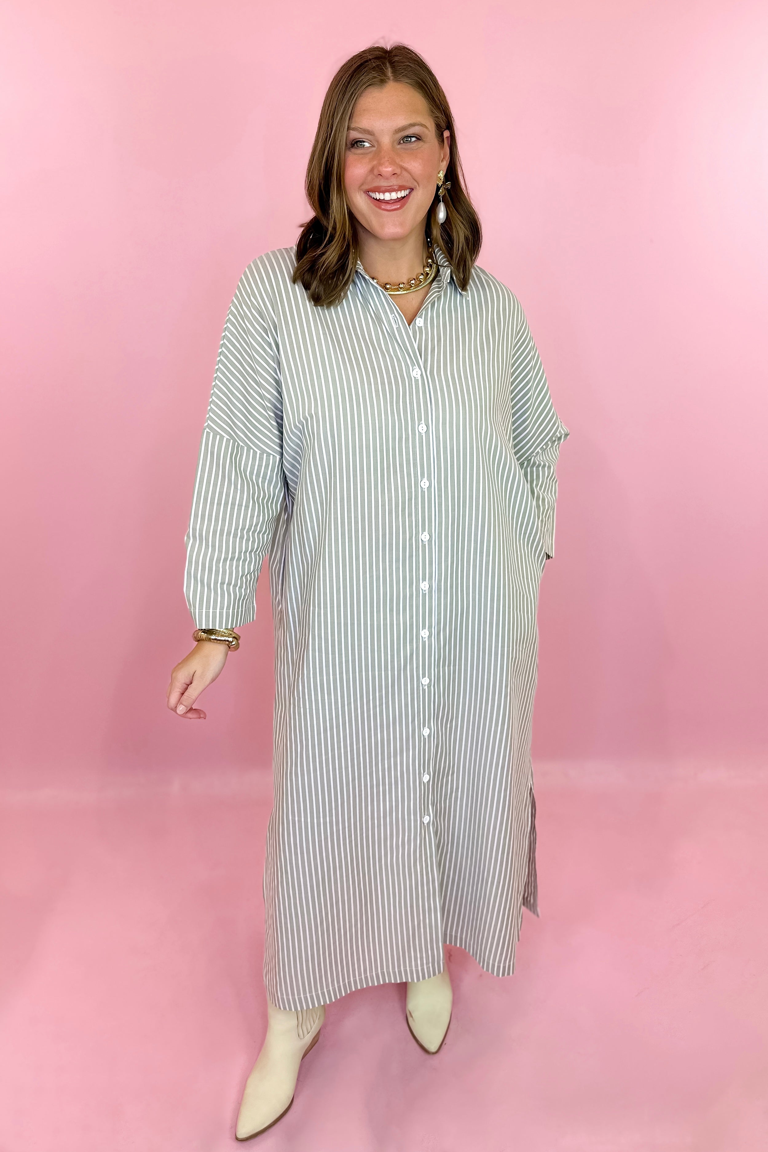 Adrienne: Regan Button Down Midi Dress - Olive Ten Stripe
