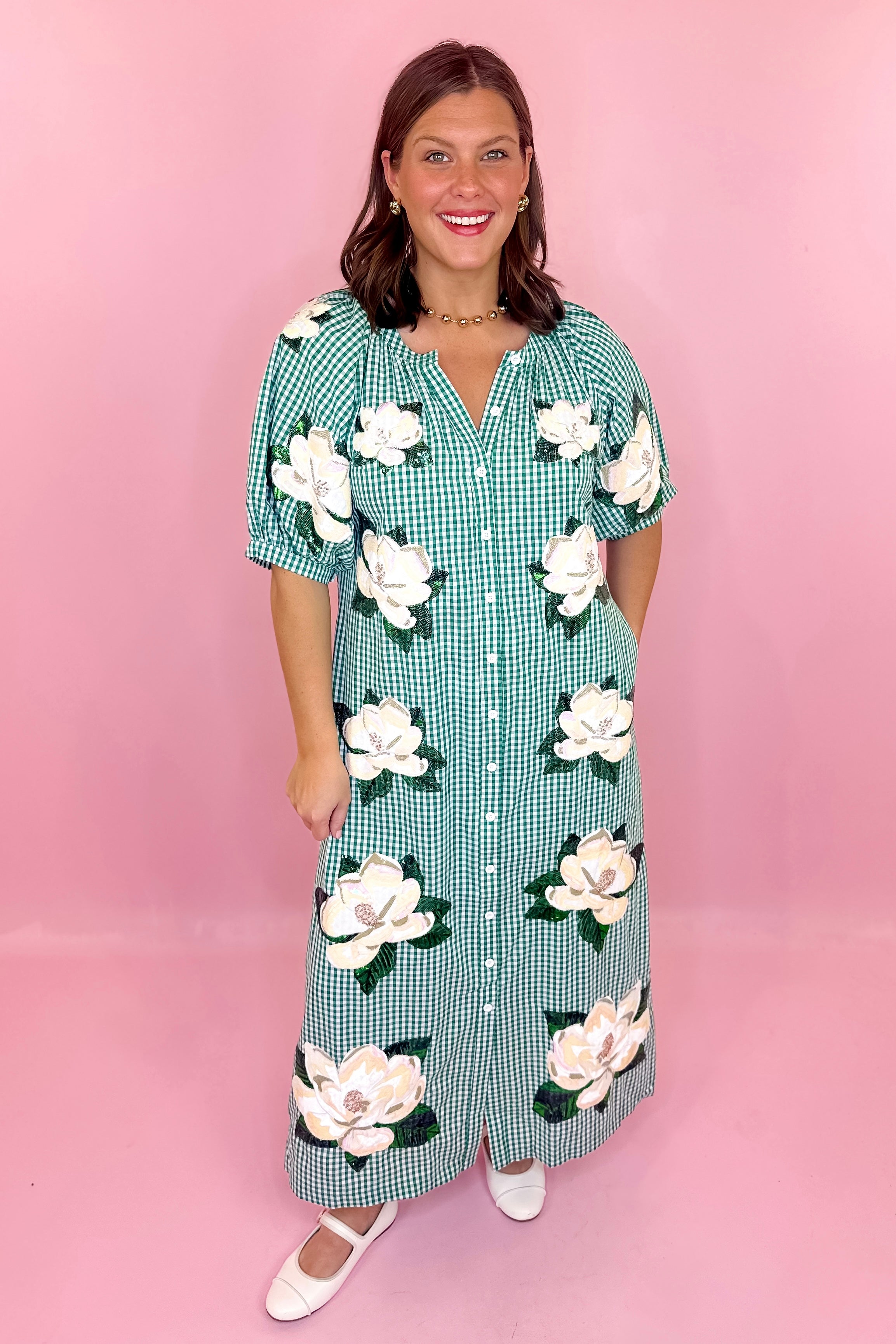 Queen Of Sparkles: Green Gingham Magnolia Button Up Midi Dress