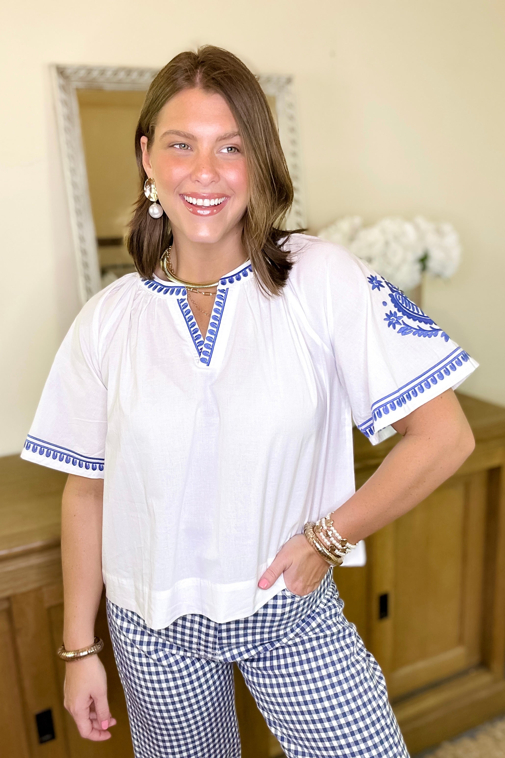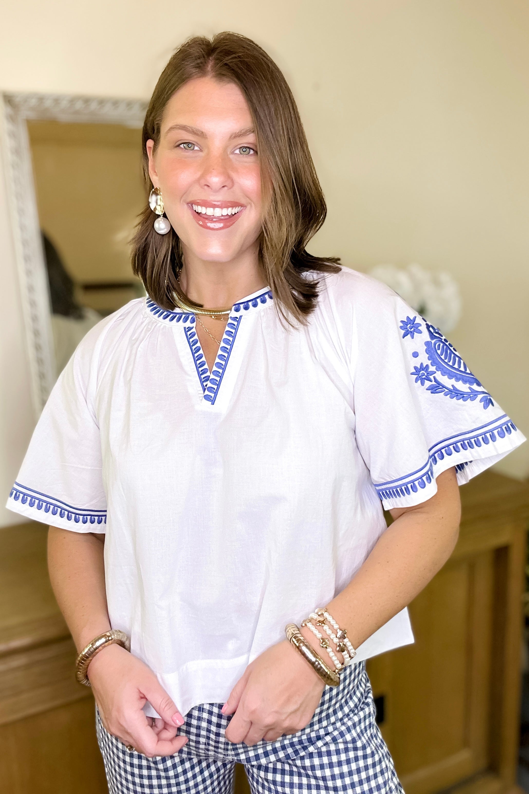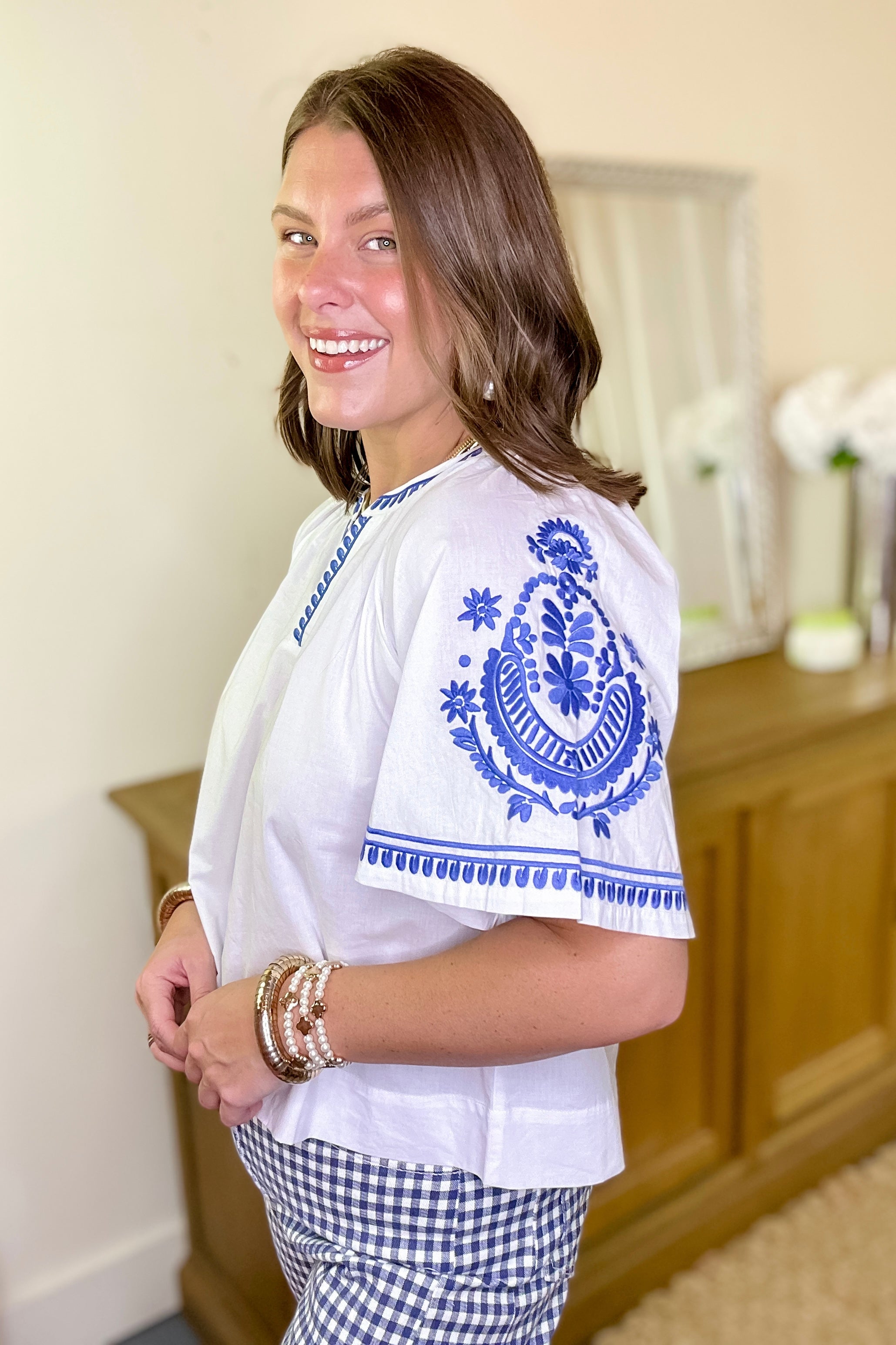 - Blue embroidery on sleeves
