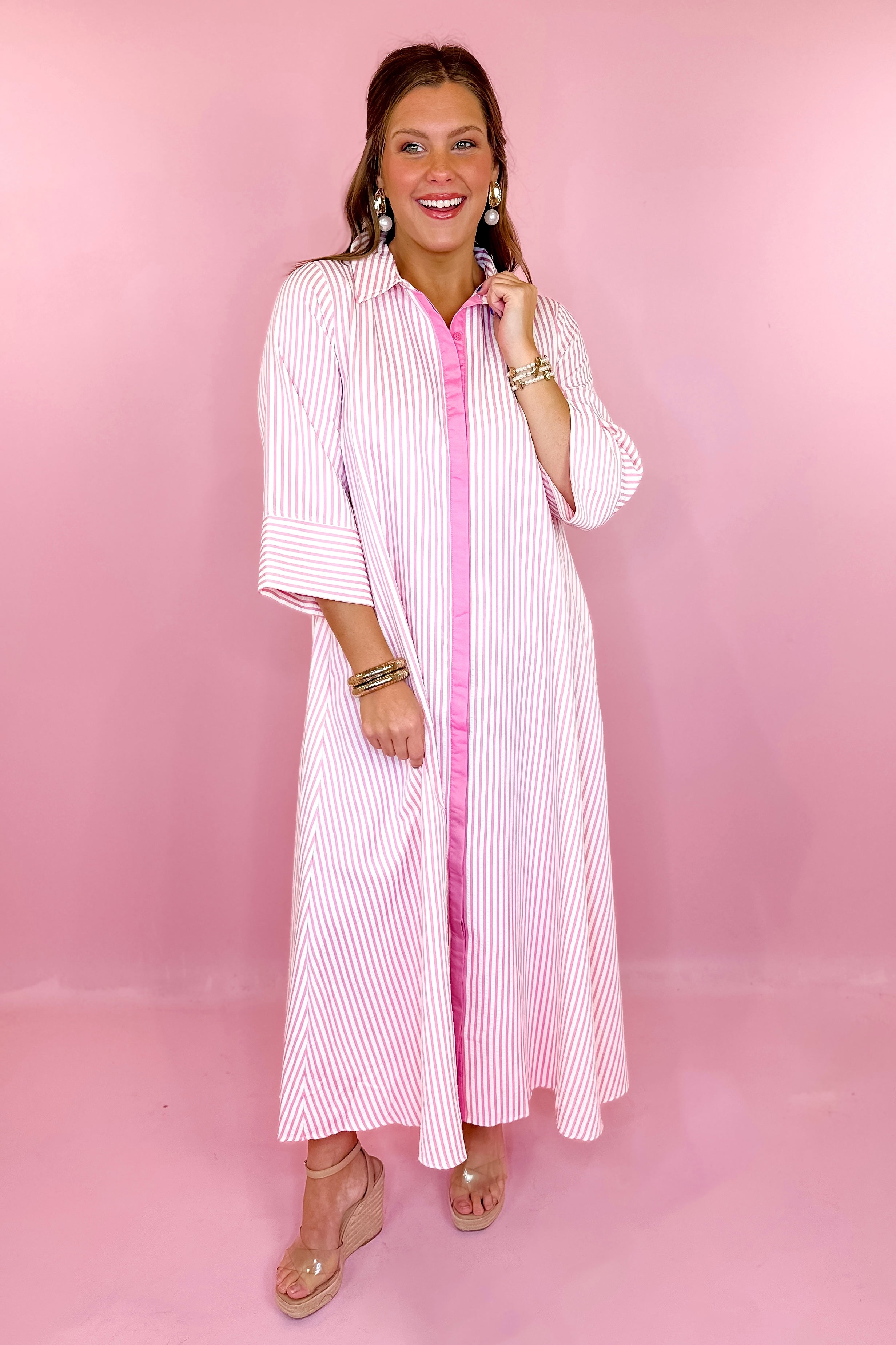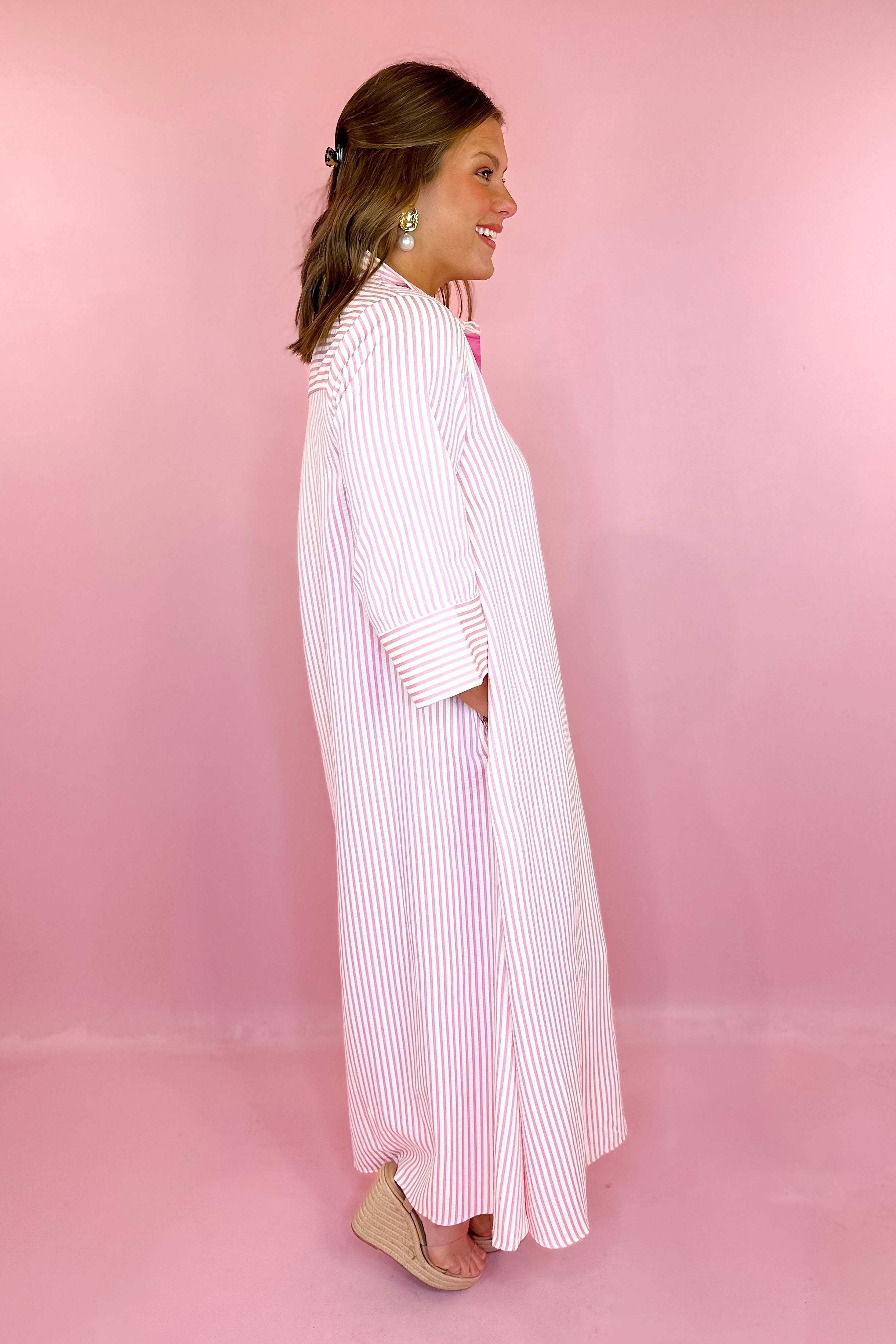 - Pink & white vertical stripe midi dress