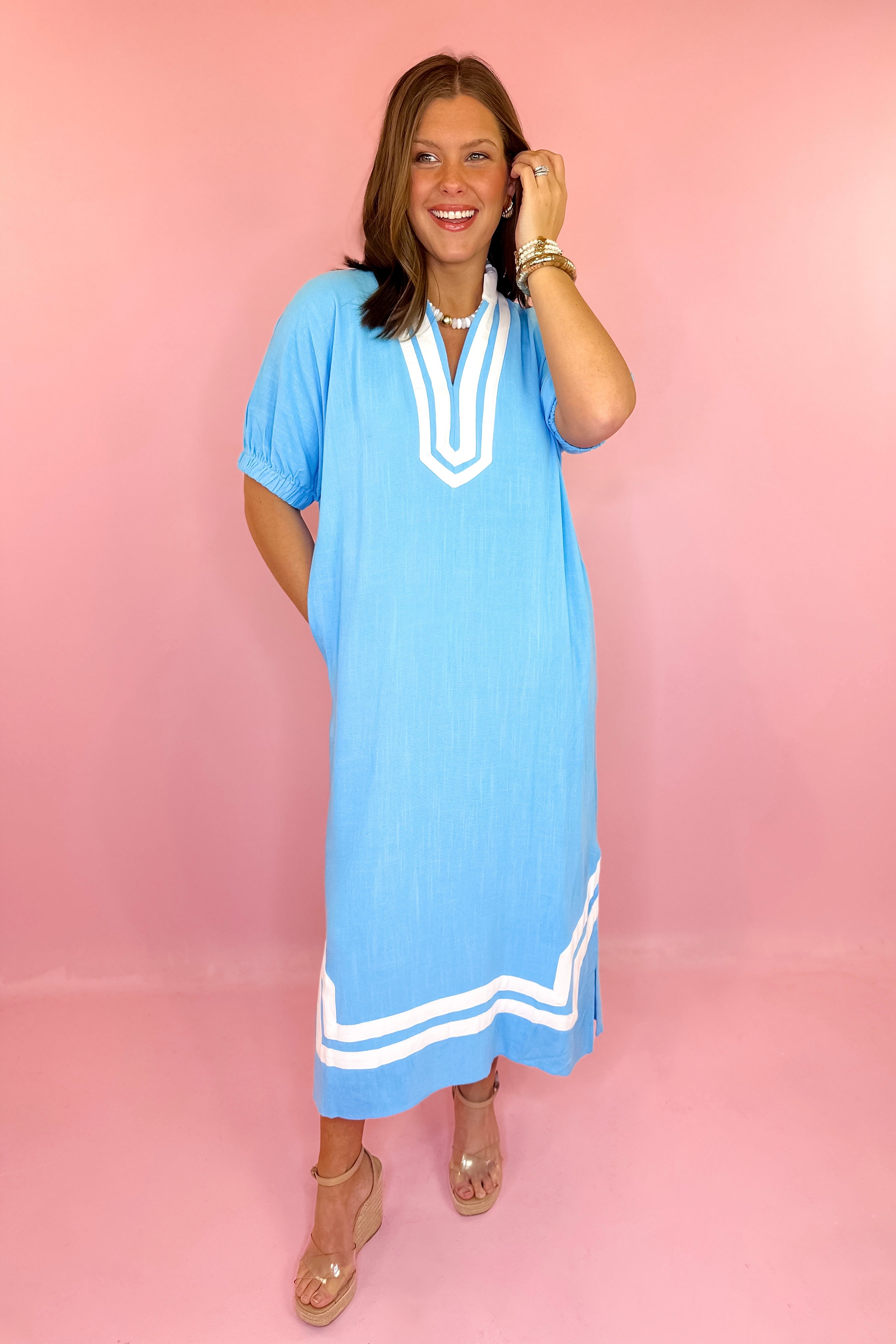• Sky blue linen midi dress