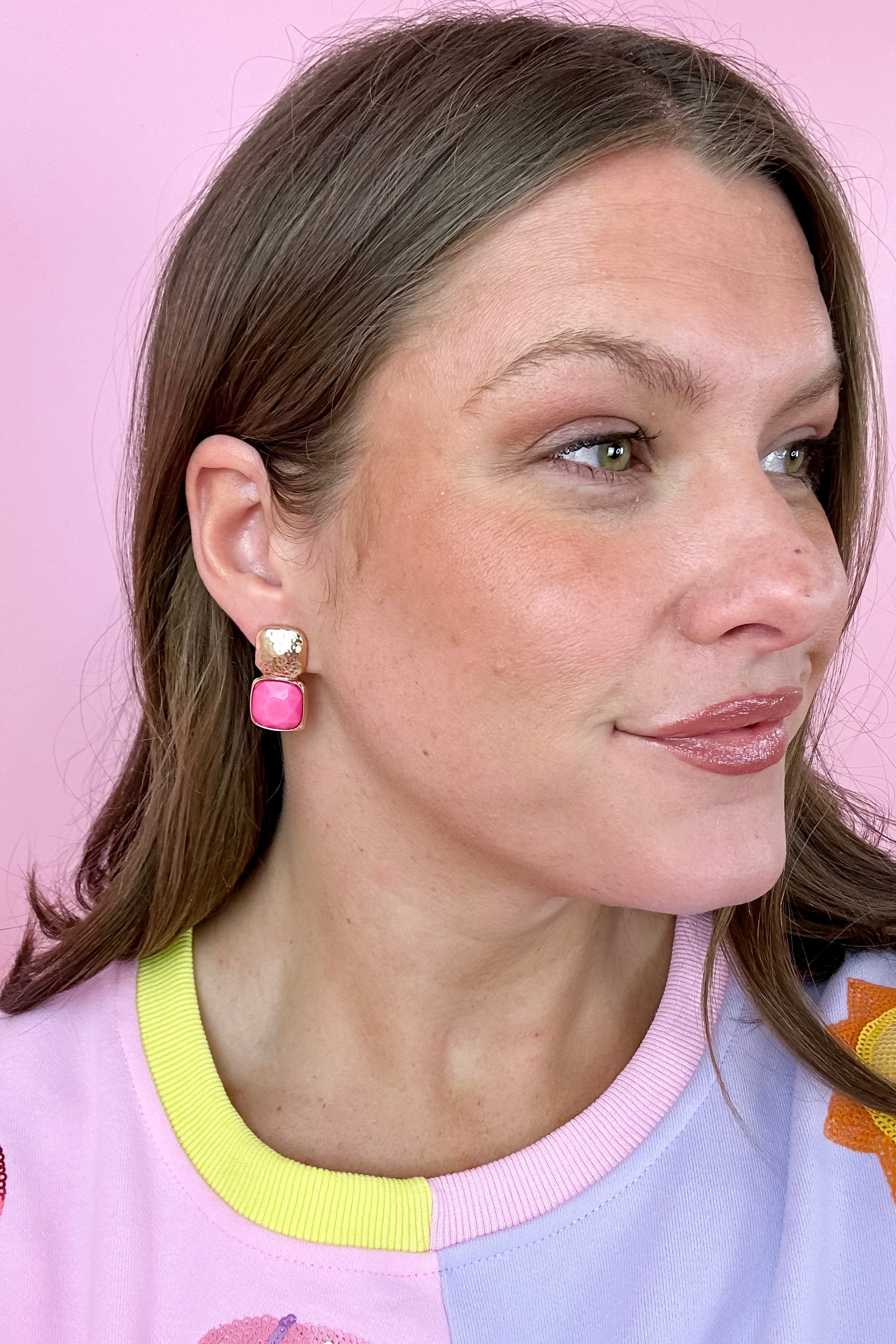 Bold Square Stone Textured Earrings - Fuchsia