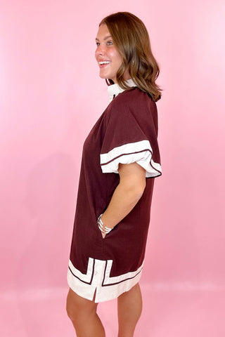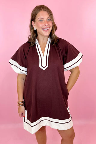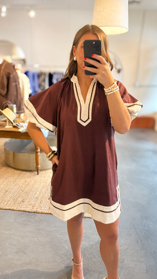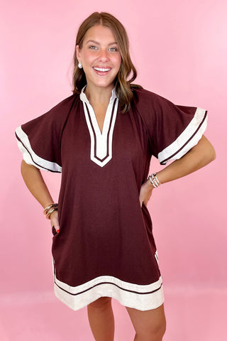 The Paradise Ahead Dress is a must have for your neutral wardrobe! This dress is giving chic vibes and features a lightweight linen material that does not wrinkle like your typically linen, a v-neckline lined in cream trim, short puff sleeves with an elastic band, side pockets, a straight relaxed fit, and a cream trim detailing on all of the hemlines.