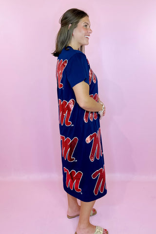 You'll be the QUEEN of game day when you have the Queen of Sparkles: Ole Miss Mascot Midi Dress on! This dress features a lightweight & breathable navy cotton with a multiple sequin Licensed Ole Miss logo's on the front and back of the dress, and a side slit on one leg. This dress features an oversized fit. We recommend sticking true to size if you want a true oversized look like pictured, or you can size down one if you would like it to look more relaxed!