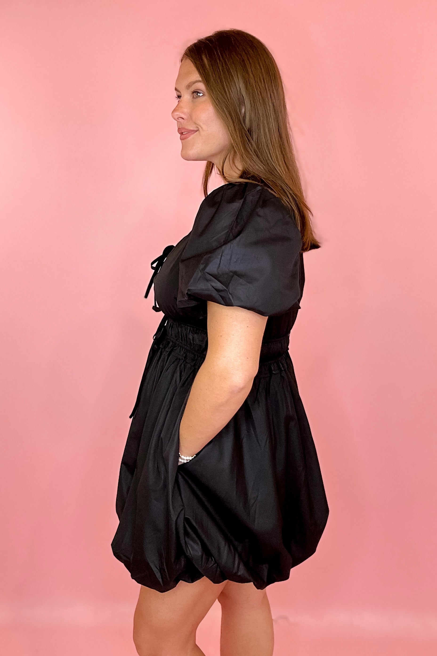 This little black mini is anything but basic—featuring puff sleeves, a smocked waist, and the cutest bow detail at the chest that adds just the right amount of feminine flair. The bubble hem brings a flirty, fashion-forward twist, giving you volume in all the right places. The V-neckline is super flattering, the smocked waist keeps things comfy and cinched, and yes—she has pockets!